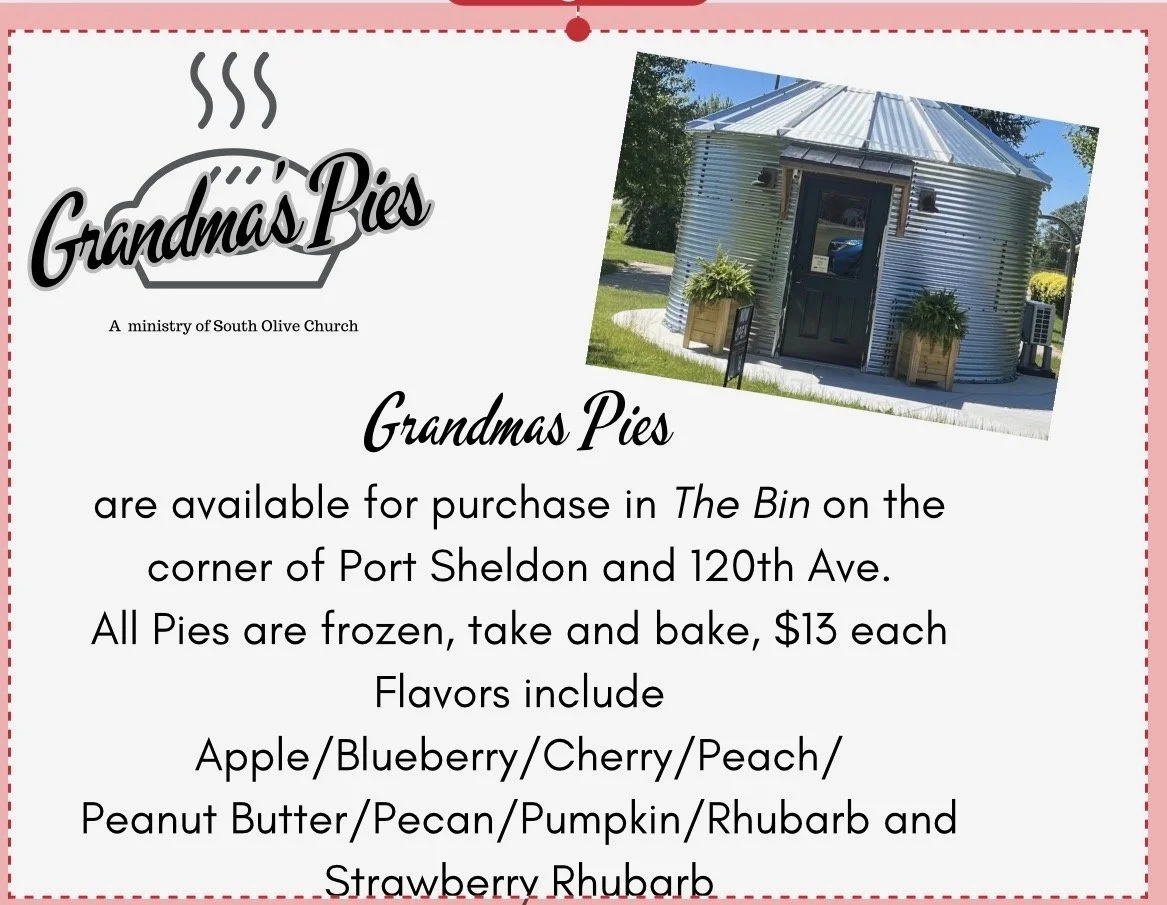 30 years ago, a group of Grandma’s got together to make pies for a fundraiser to help build the new gym at South Olive School. These Grandma’s also belonged to a woman’s group called the Loving Service ladies group at South Olive Church. After the fundraiser, the Grandma’s decided that they would continue making pies to sell and donate the money to other kingdom causes at the church, in the Holland area and around the world!